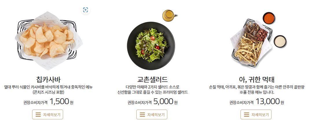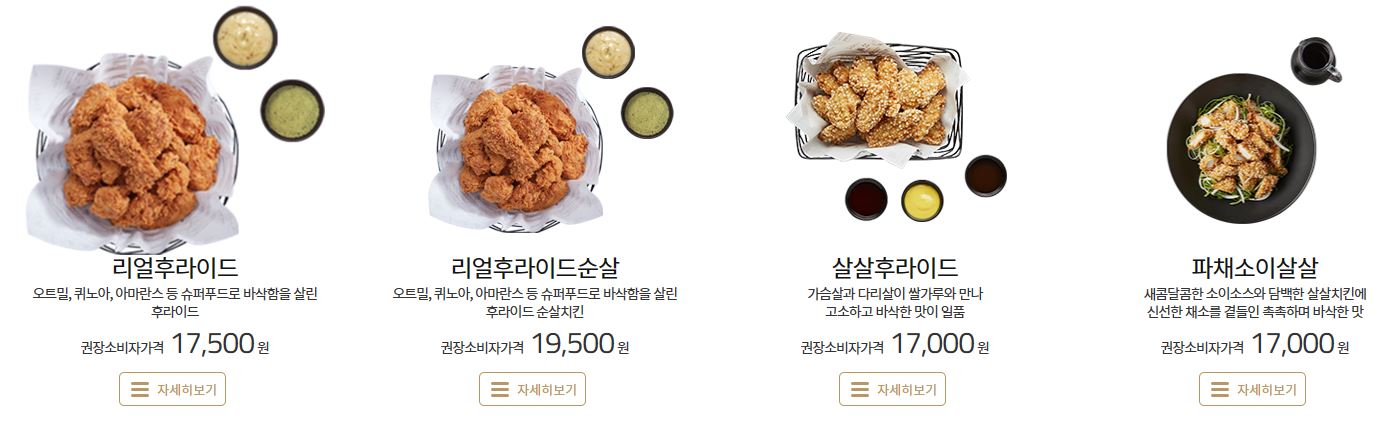짧은 기간동안 다양한 사이드 메뉴가 더 추가되었습니다. 치킨을 주문할 때 한 마리론 아쉽고 두 마리로는 많을 때 보통 사이드 메뉴를 많이 찾아보곤 합니다. 교촌치킨의 경우 간단하게 치킨과 함께 먹을 치즈볼, 감자튀김을 시작으로 안주 메뉴로도 먹기 좋은 먹태, 어묵탕, 닭발, 떡볶이 등이 사이드로 판매되고 있습니다. 시중에 간단히 먹을 수 있는 냉동식품으로도 판매가 되고 있는 볶음밥까지 함께 판매됩니다.