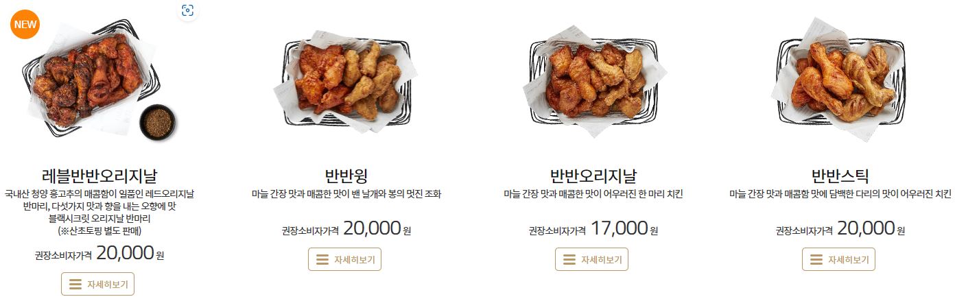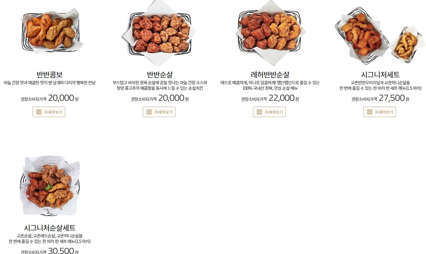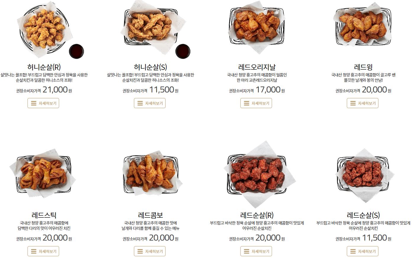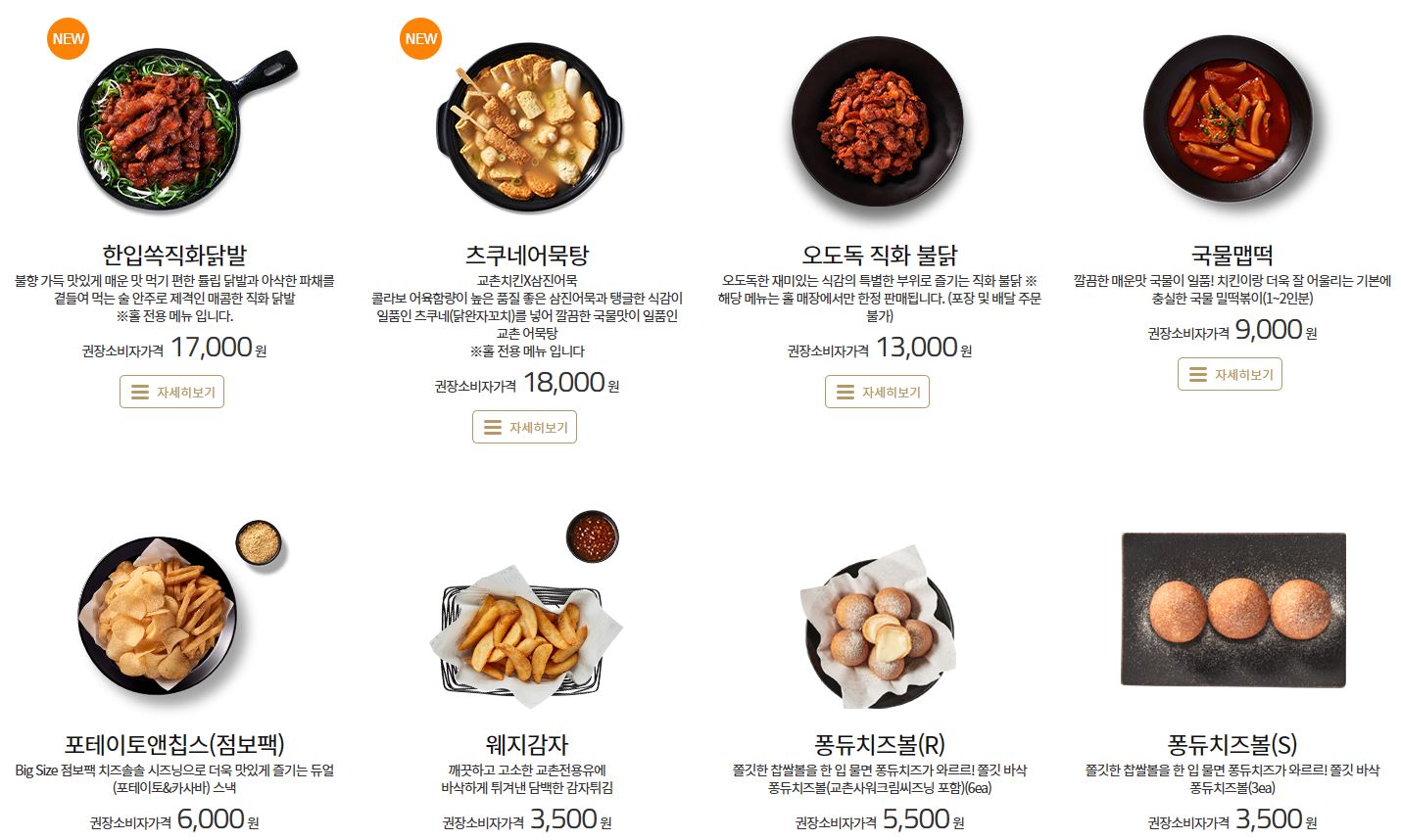 아래의 메뉴들은 교촌치킨의 전체 메뉴입니다. NEW 아이콘이 붙어있는 치킨의 경우 신메뉴로 이번에 5개가 추가가 됐습니다. 인기가 많은 오리지날부터 허니 시리즈, 레드 시리즈, 반반 시리즈, 새로 나온 블랙 시크릿 시리즈가 있습니다. 새로 등장한 신메뉴의 경우 다섯 가지 맛과 향을 내는 오향에 맛 간장과 흑임자, 청양고추를 더한 깊은 풍미를 느낄 수 있는 치킨으로 아주 주목받고 있습니다. 허니 콤보의 경우 엽기 떡볶이와 함께 먹는 모임, 파티 세트로도 유명하죠.