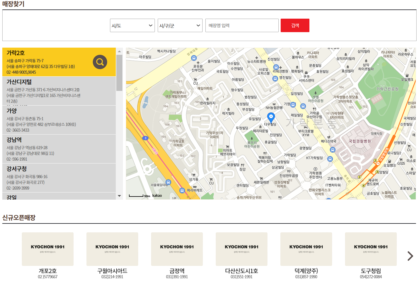 찾고자 하는 매장은 교촌치킨 공식 홈페이지에 방문하면 신규 오픈 매장 포함한 전국 매장의 윤영시간 및 휴무일을 확인할 수 있습니다. 매장명 입력 또는 시/도를 체크하고 클릭을 하면 원하는 지점을 바로 찾을 수 있으며, 지도로 자세한 위치가 표시되어 나옵니다. 원하는 매장을 찾게 되면 해당 매장의 상세 정보 조회가 가능합니다. 매장명, 전화번호, 주소, 영업시간, 특이사항을 확인할 수 있습니다. 특이사항의 경우 배달 진행 여부, 홀 이용 가능 여부, 포장 여부, 예약, 와이 파이 등 편리하게 한눈에 보기 쉽게 정리되어 있습니다. 더 자세한 정보는 교촌치킨 공식 홈페이지를 통해 확인 가능합니다.